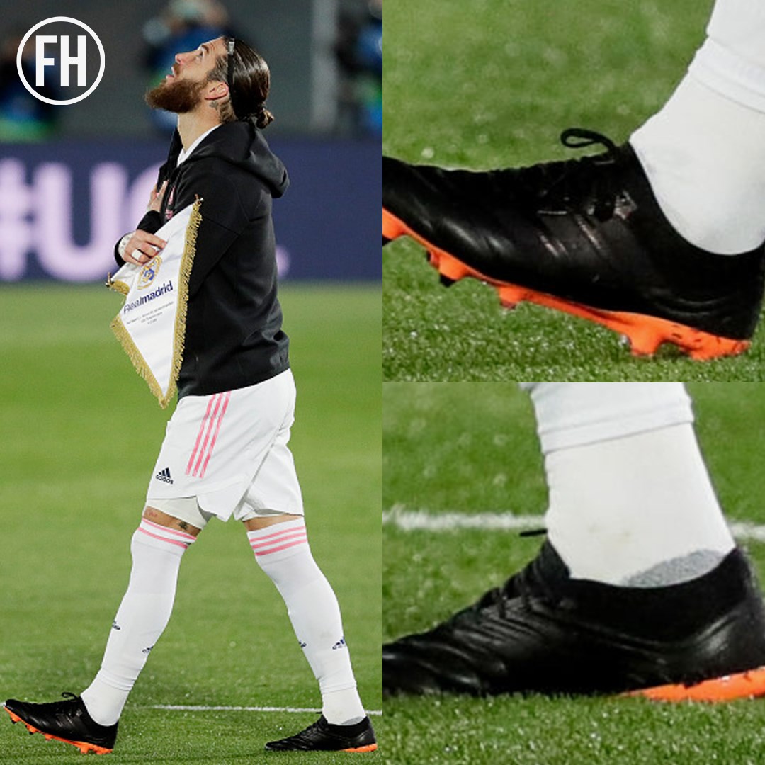 Sergio Ramos trug die SG-Version der Fußballschuhe Precision to Blur Adidas Copa 20.1, wie ein genauer Blick auf die auffällige orangefarbene Sohlenplatte verrät.