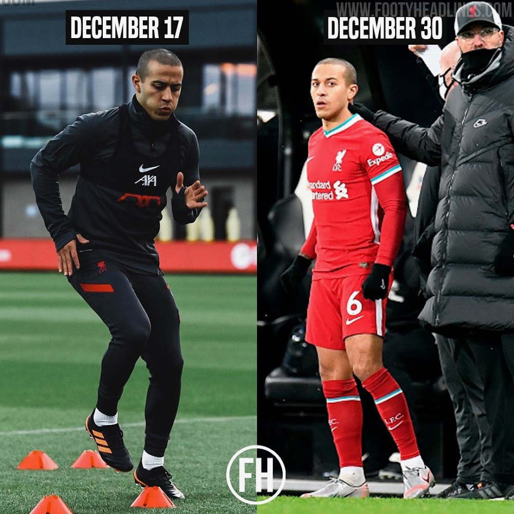 Update #2: Gestern Abend startete Thiago für Liverpool gegen Tabellenführer Manchester United. Das Spiel selbst war eine enge Angelegenheit mit einem Vorteil für United, die beinahe Liverpools Heimrekord gebrochen hätten, aber es war nicht die fußballerische Leistung, die uns auffiel: Thiago Alcántara überrascht weiterhin, indem er gegen Manchester United schwarze Nike Phantom Venom Schuhe trägt. Die Tatsache, dass Thiago bei offiziellen Spielen nicht mehr für Nike aufläuft, macht einen möglichen Markenwechsel noch wahrscheinlicher. Halte die Augen offen.