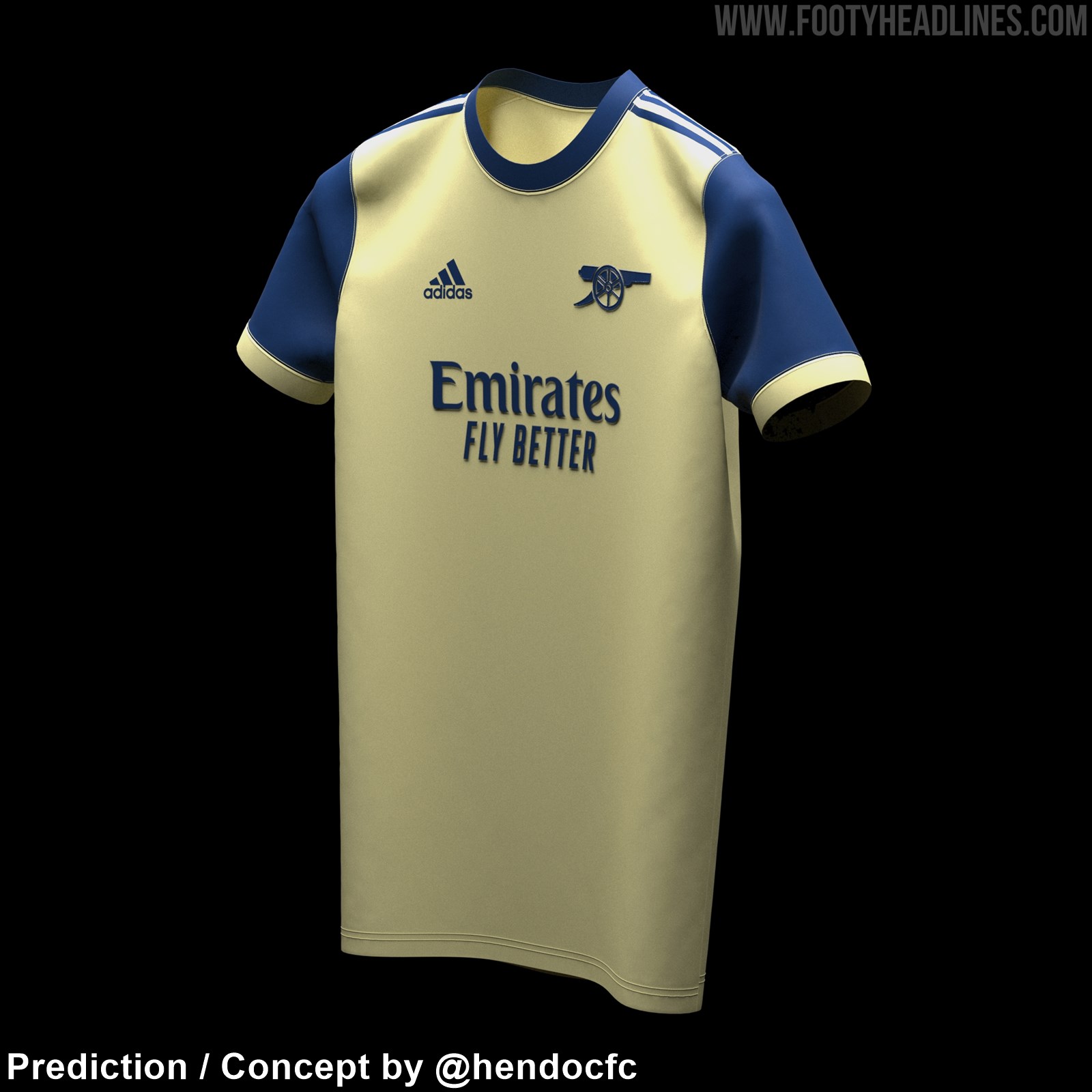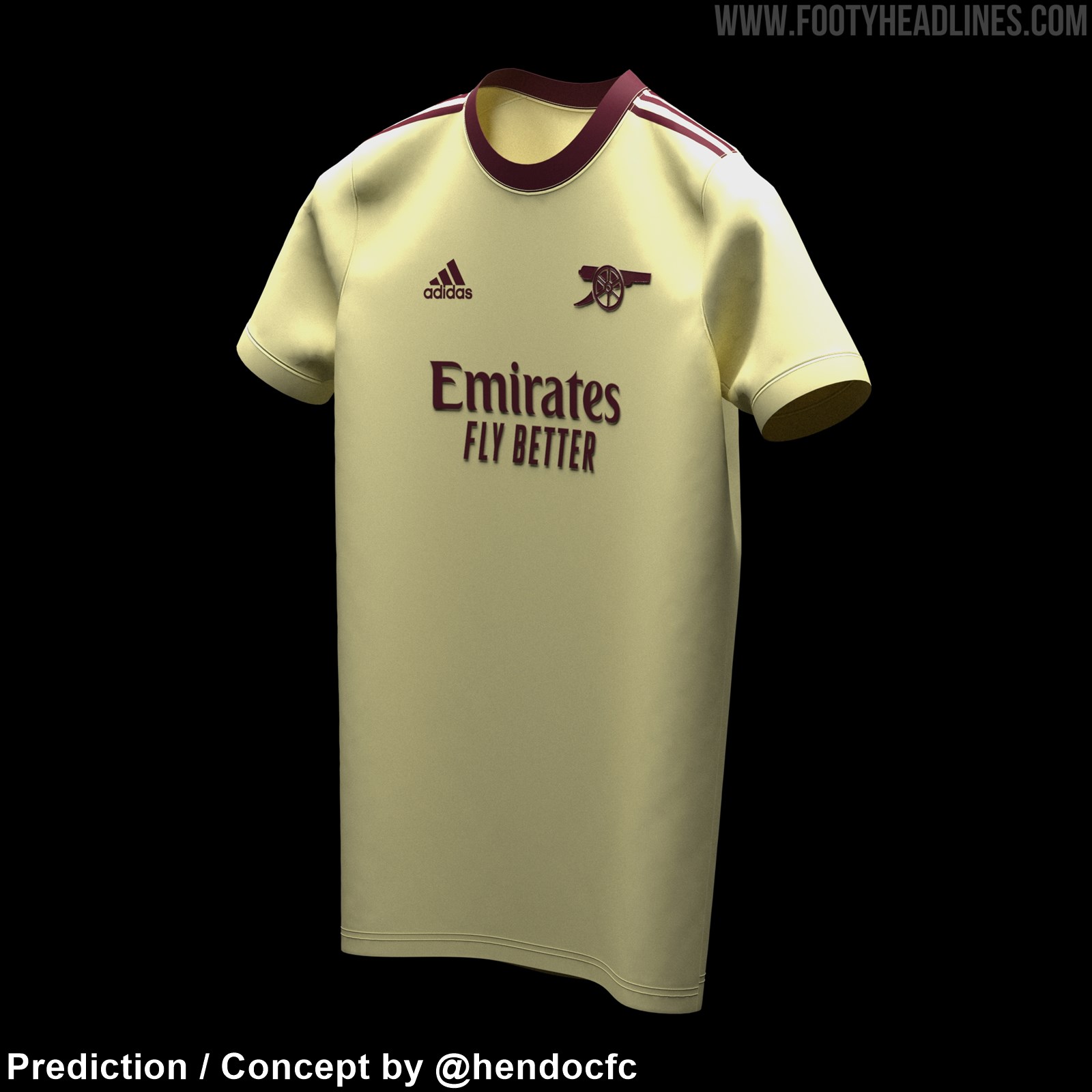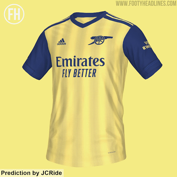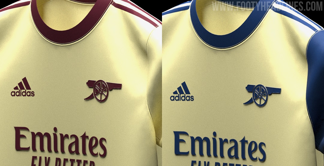 Die beiden von @hendocfc's erstellten Konzepte für Arsenals 21-22 Auswärtstrikotkonzepte berücksichtigen alle durchgesickerten Informationen - das Trikot ist hauptsächlich 'Pearl Citrine', entweder kombiniert mit roten / blauen Applikationen.