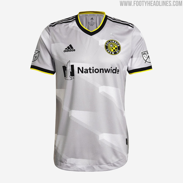 Das Adidas Columbus Crew 2021 Trikot ist überwiegend grau ('Grey Two') mit einem geometrischen Grafikdruck auf der Vorderseite und den Ärmeln. Die Rückseite ist einfarbig weiß.