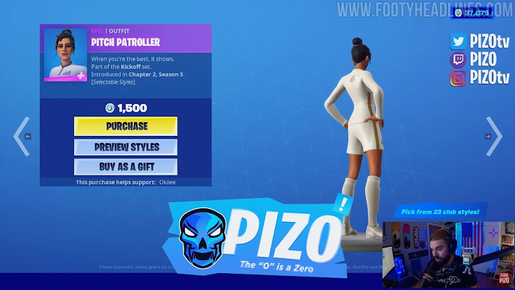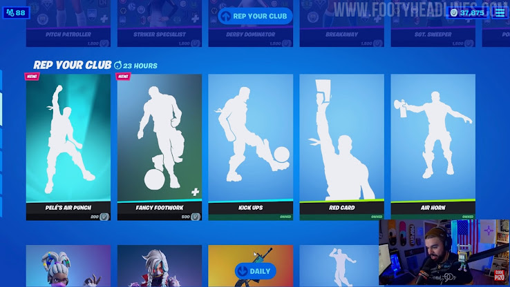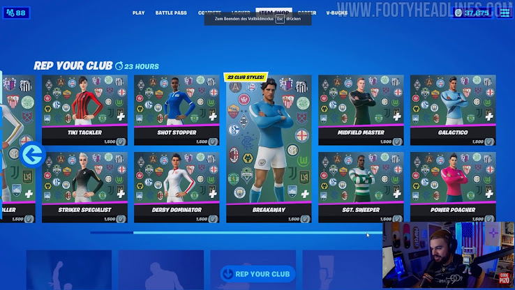 Update: Wir haben Bilder von allen 23 Fortnite Skins und dem In-Game Item Shop am 24. Januar 2021 hinzugefügt. Es sind 10 verschiedene Charaktere für je 15 US-Dollar (1.500 V-Bucks) erhältlich. Wenn du einen Charakter kaufst, kannst du alle 23 Teams nutzen. Es gibt auch ein paar kurze Animationen wie z.B. 'Rote Karte' oder 'Pelé's Air Punch'. Schau es dir unten an.