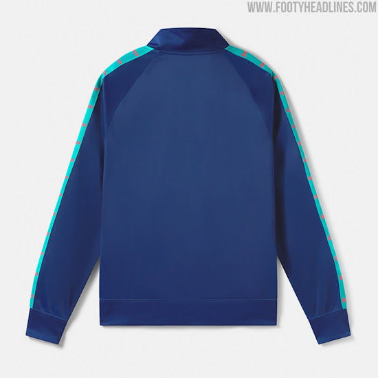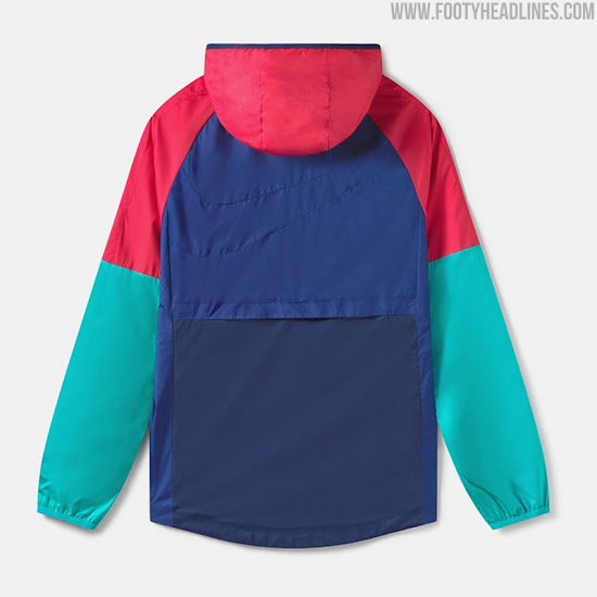 Basierend auf Nikes regulärer 20-21 Trainingsvorlage, kombiniert das Nike Barcelona 2021 Trainingsshirt einen blauen Körper mit türkisfarbenen Ärmeln und korallenroten Akzenten wie dem Rundhalskragen, den Logos auf der Brust und einem Streifen, der auf jedem Ärmel verläuft. Eine einfarbige korallfarbene Wiedergabe des Vereinswappens befindet sich auf der linken Brust, während ein dezentes Muster den Körper bedeckt.