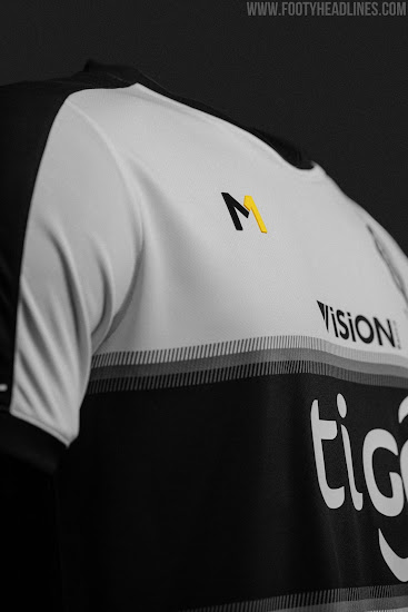 Hauptsächlich weiß, weist das Meta Sports Club Olimpia 2021 Trikot ein breites schwarzes horizontales Band zwischen Brust und Bauch auf, das nach oben und unten hin sanft mit gräulichen Schattierungen ausläuft. Ein schwarzer V-Ausschnitt mit weißer Zierleiste, schwarze Ärmelbündchen und ein schwarzer Streifen, der oben auf den Ärmeln verläuft, runden das schlichte Erscheinungsbild ab.