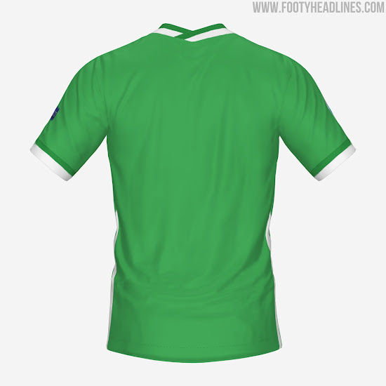 Auf der Brust befinden sich weiße Logos, darunter eine einfarbig weiße Wiedergabe des Verbandslogos, während ein dunklerer Grünton als Besatz an den Ärmelbündchen und am Kragen implementiert ist.