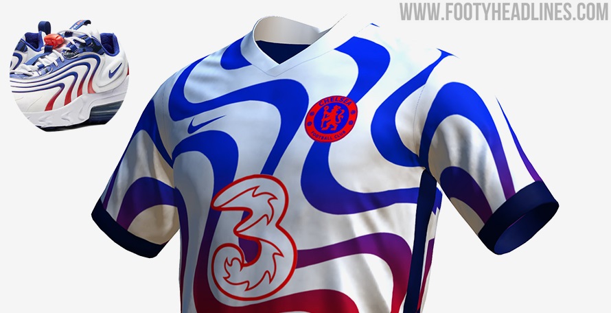 Chelseas 2020-2021 Air Max Konzepttrikot basiert auf den Informationen, die wir Anfang der Woche über Chelseas kommendes viertes Trikot für 2020-21 geteilt haben. Wir wissen, dass das Hauptthema der Air Max Sneaker sein wird, der bereits das dritte Trikot des Vereins für 2020-2021 inspiriert hat, aber dieses Mal wird das Trikot möglicherweise näher an seiner Inspiration sein, da es auch eine weiße Basis hat.