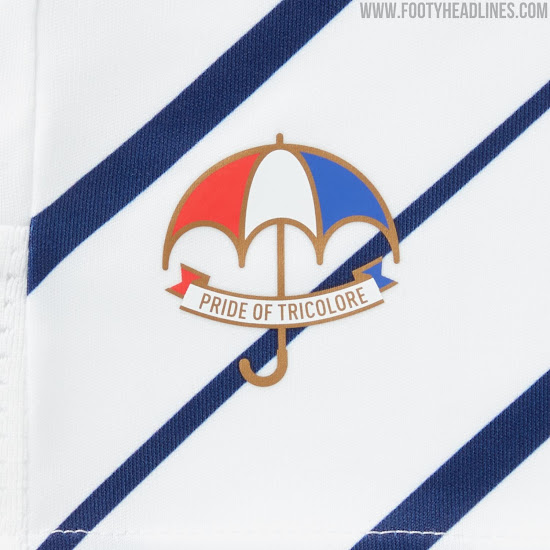 Das Adidas Yokohama F. Marinos 2021 Auswärtstrikot ist hauptsächlich weiß mit marineblauen Diagonalstreifen, die von rechts unten nach links oben verlaufen. Am weißen V-Ausschnitt und an den Ärmelbündchen gibt es rote Einfassungen, während die Sponsorenlogos ebenfalls marineblau sind.