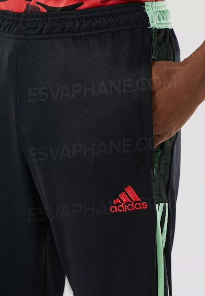 Die neuen Adidas Man Utd Spring 2021 Shirts kombinieren die Hauptfarbe 'Glory Mint' mit dunkelroten Logos und schwarzen Three Stripes. Der Windbreaker der Kollektion ist hauptsächlich schwarz mit 'rot' und 'glory mint', genauso wie die Hosen und Hosen.