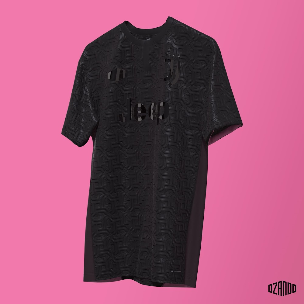 Das Juventus Konzept Fußballtrikot ist fast komplett schwarz und kombiniert eine schwarze Basis mit einem etwas dunkleren reflektierenden Farbton für die Sponsorenlogos auf der Brust und den Namen und die Nummer auf dem Rücken.