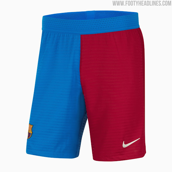 Die Hosen des Heimtrikots des FC Barcelona 21-22 sind halb blau und halb rot. Die Stutzen sind blau mit zwei roten Querstreifen. Anstelle der üblichen Vereinsinitialen ist auf der Vorderseite direkt über dem Swoosh der Spitzname der Anhänger des Vereins, Culers, aufgestickt.