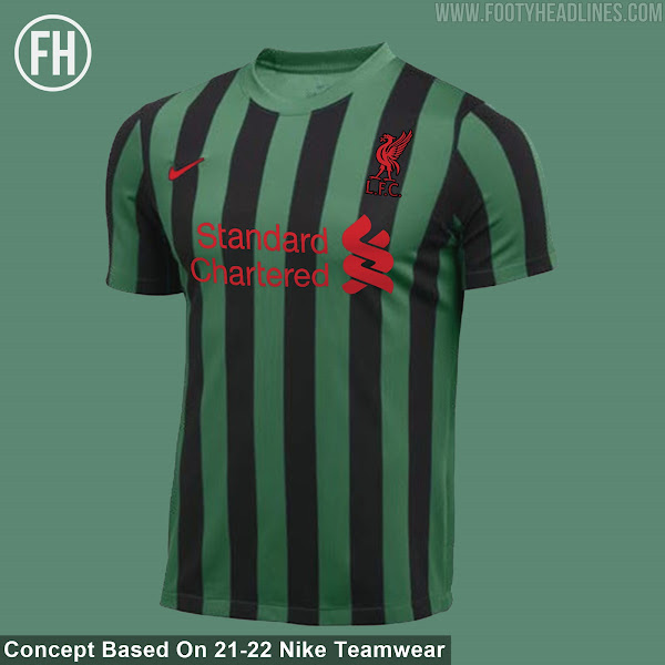 Das hier ist unser Favorit. Das LFC 21-22 dritte Trikotkonzept basiert auf dem Nike Striped Division 4 Teamwear Trikot, nur mit einem roten Swoosh und Liverpools Logos.