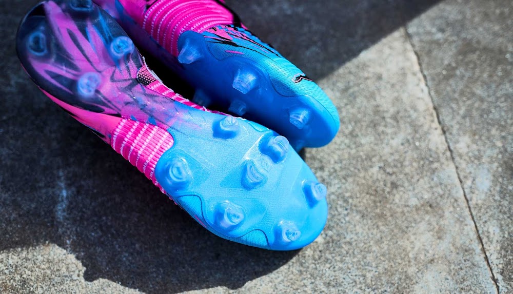 Die neuen Puma Future Z Fußballschuhe bestechen durch einen mutigen und stylischen Look in Schwarz, Blau und Pink. Die neuen Puma Future Z Fußballschuhe kommen mit einem einzigartigen grafischen Design über den ganzen Schuh.