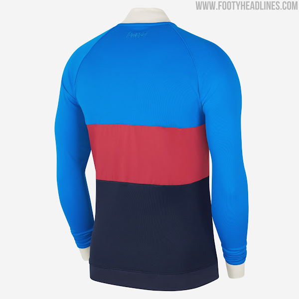 Die Nike FC Barcelona 2021-22 Heimjacke kombiniert die gleichen Farben wie das aktuelle FC Barcelona 21-22 Trikot ("Soar / Noble Red / Pale Ivory"), nur mit einer vierten Farbe - dark navy (offiziell Obsidian).