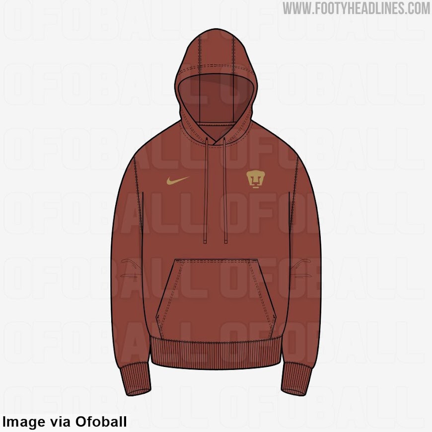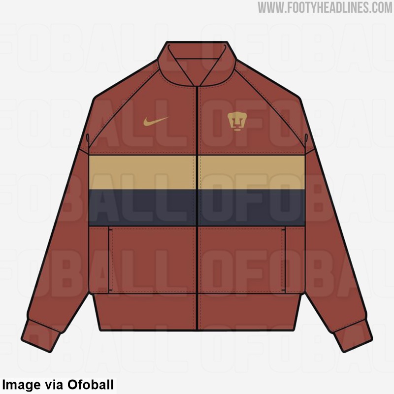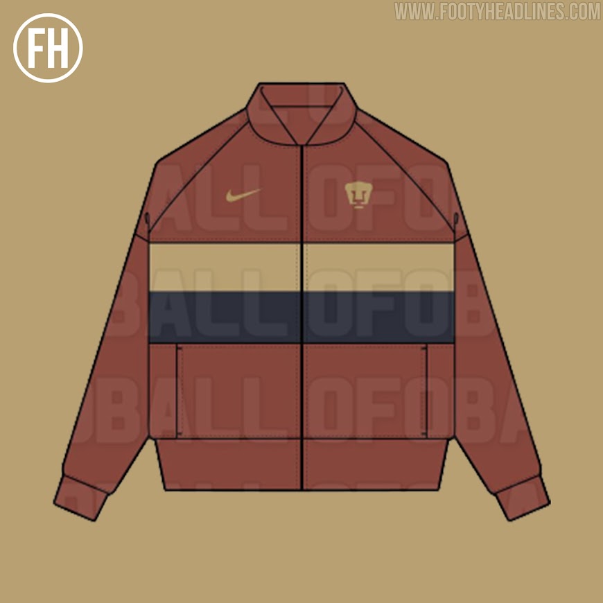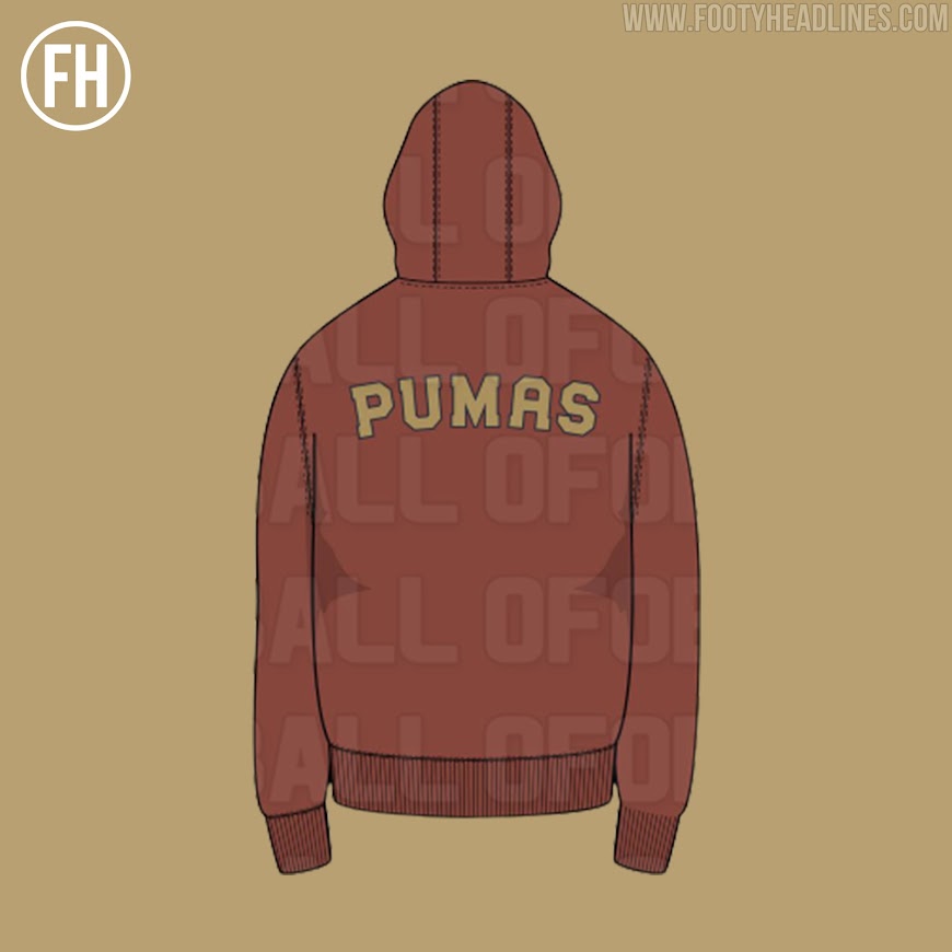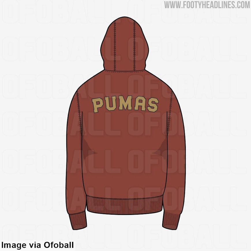 Eine durchgesickerte Einlaufjacke für 2022 kombiniert eine kastanienbraune Basis mit einem goldenen / marineblauen Bruststreifen, während ein Hoodie kastanienbraun mit einem goldenen Pumas Schriftzug auf dem Rücken ist.