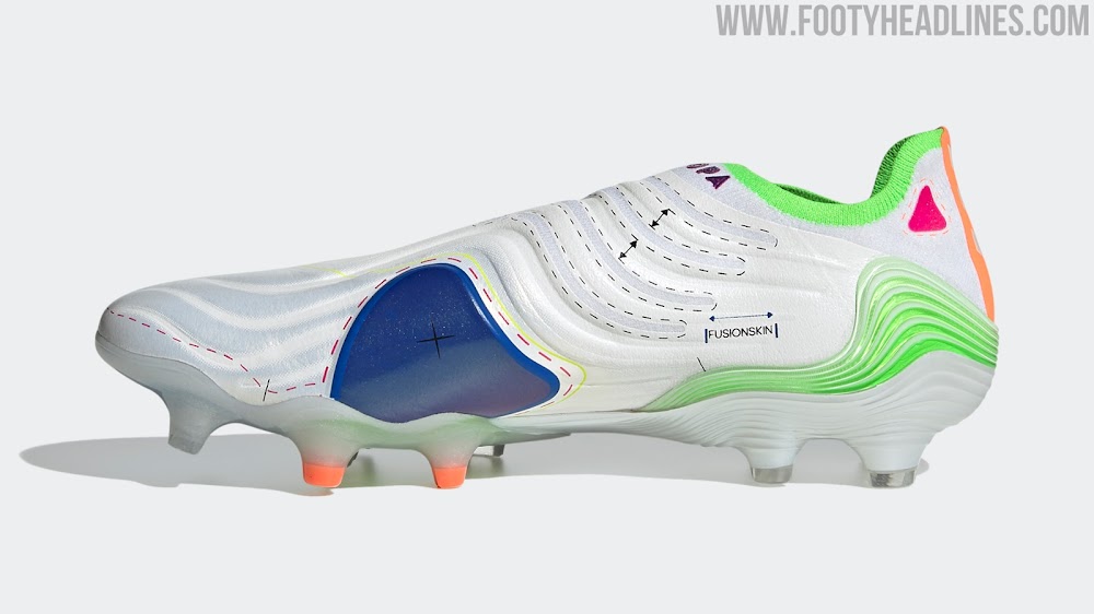 Technisch gesehen sind die adidas Copa Sense+ Inner Life Fußballschuhe in Weiß/Grün/Rot/Gelb so wie immer.