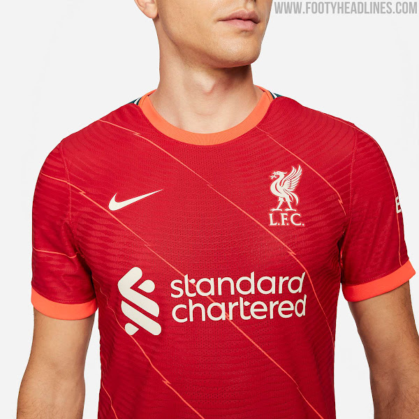 Liverpools Trikot 2021-22 wird von Standard Chartered gesponsert, wobei das neue Logo des Unternehmens auf der Vorderseite und Expedia auf dem linken Ärmel sein Debüt feiert.