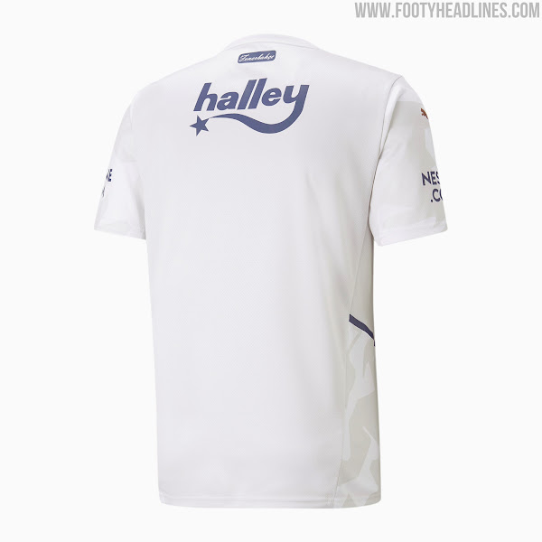 Das Puma Fenerbahce SK 2021-22 Auswärtstrikot führt einen modernen Look für die türkische Mannschaft ein. Es kombiniert eine off-white Basis mit navyfarbenen Logos. Die offiziellen Farben sind "Gletschergrau/Weiß".