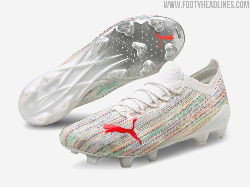 Als Teil des Spectra Packs kombiniert der Puma 'Spectra Pack' Ultra 1.2 Fußballschuhe eine weiße Basis mit einem mehrfarbigen Obermaterial. Alle Logos sind "Red Blast".
