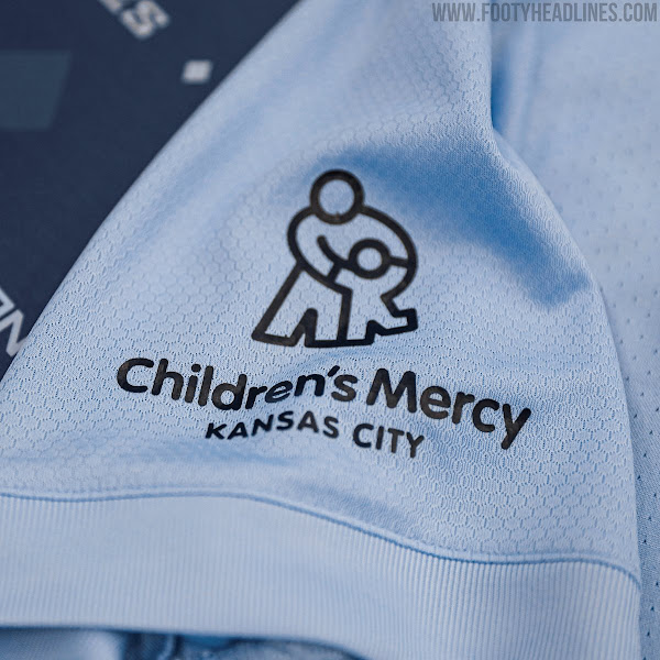 Alle Marken- und Sponsorenlogos sind ebenfalls hellblau oder marineblau, je nachdem wo sie platziert sind. Auf dem Nacken des Trikots sind die SKC-Initialen in Argyle zu sehen, auf der Innenseite des Nackens ist das Mantra "Two States, One City, One Club" zu sehen.