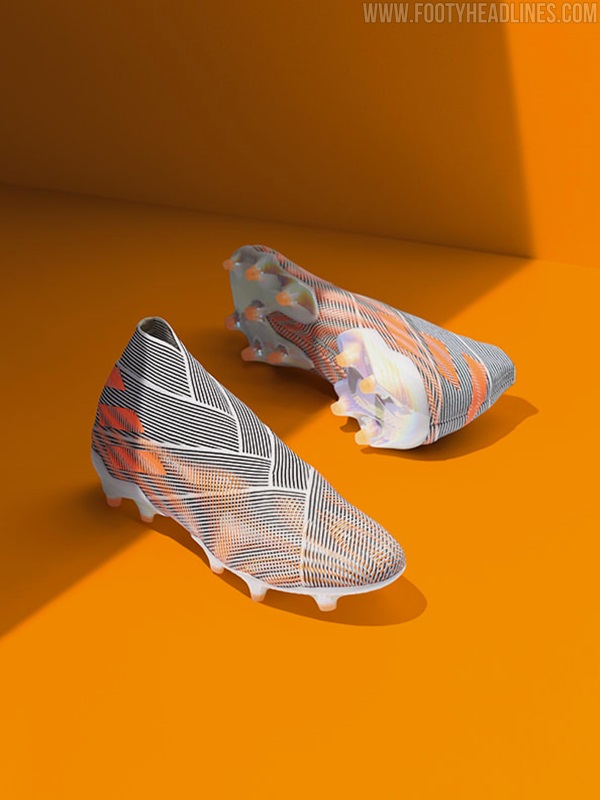 Die Adidas Nemeziz+ Fußballschuhe aus dem Superspectral Pack kombinieren drei Farben - weiß, orange und schwarz. Die neuen Adidas Nemeziz+ Superspectral Fußballschuhe werden hauptsächlich weiß sein, wobei Orange für die Three Stripes und Schwarz für Applikationen und Designelemente verwendet wird.