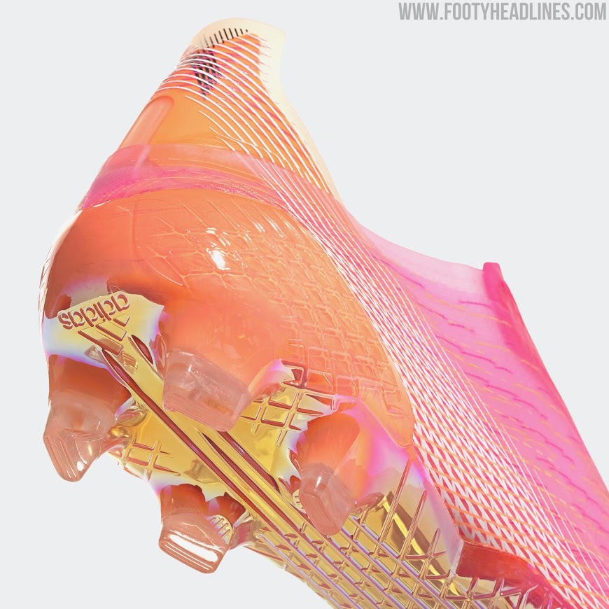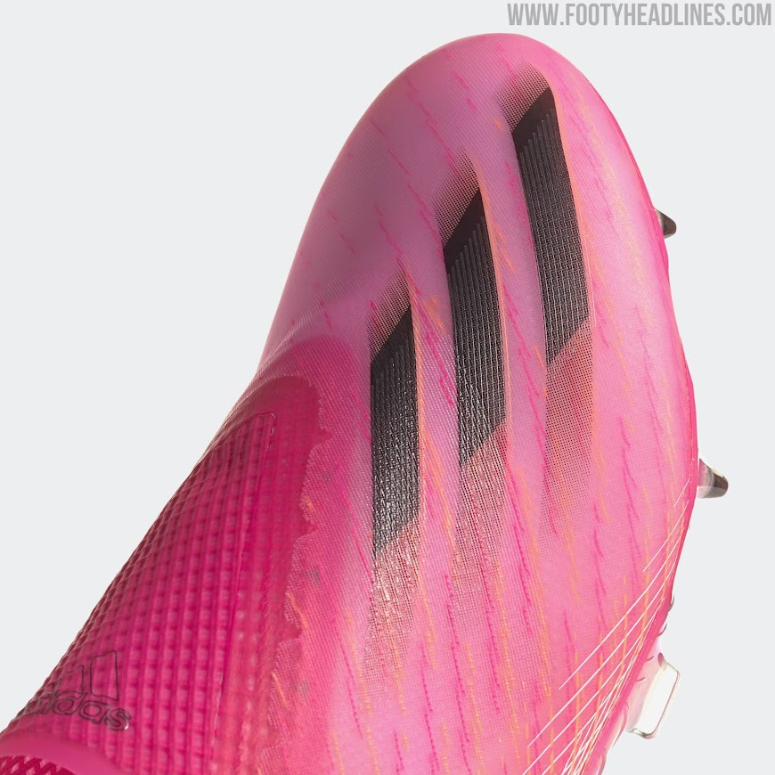 Der adidas X Ghosted.1 Fußballschuhe aus dem Superspectral Pack ist hauptsächlich pink und kombiniert diese auffällige Basis mit gleichfarbigen Schnürsenkeln, während die Three Stripes auf dem Touchbereich schwarz sind und an den Seiten zu einem blassen Orange verblassen. Die Außensohle ist komplett orange, während es ein Muster aus sich kreuzenden orangefarbenen Linien auf dem Außenrist und schwarzen an der Ferse gibt.