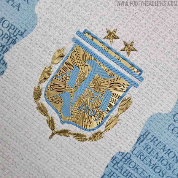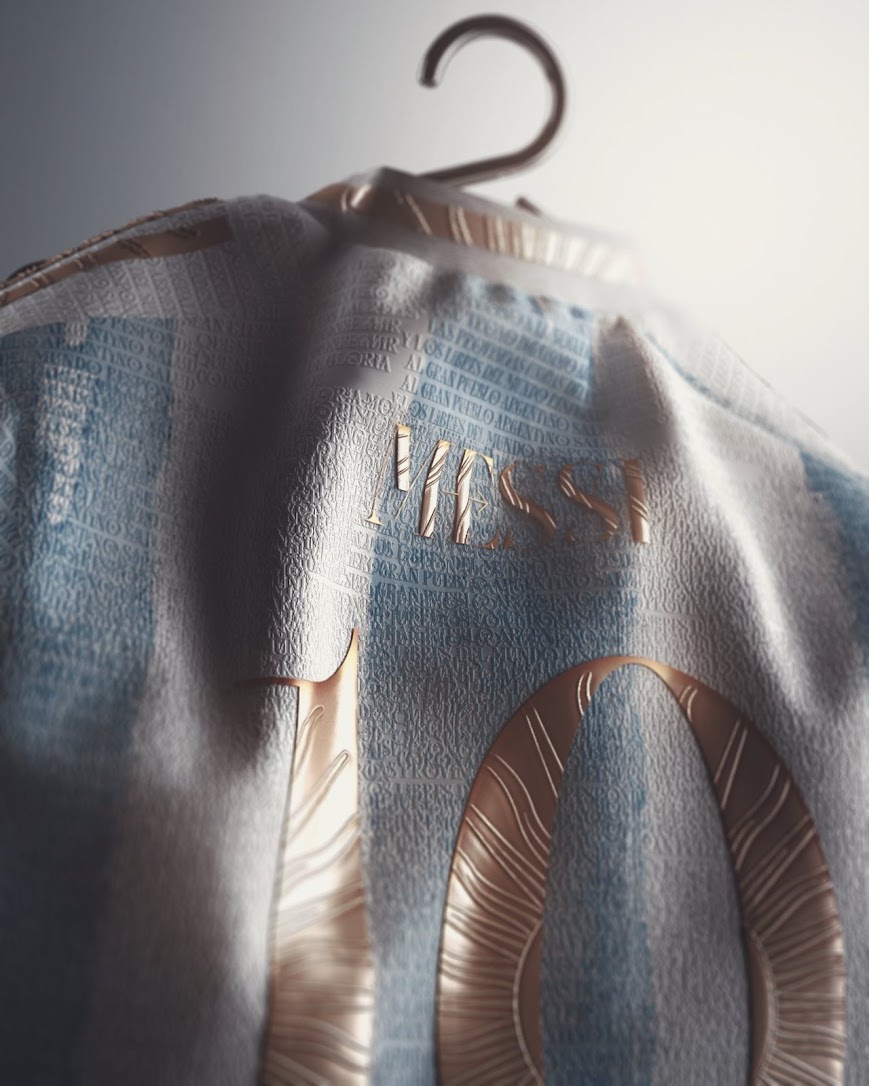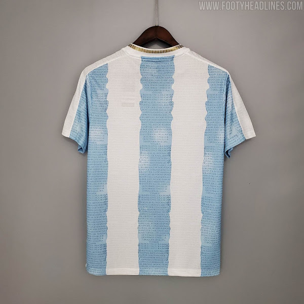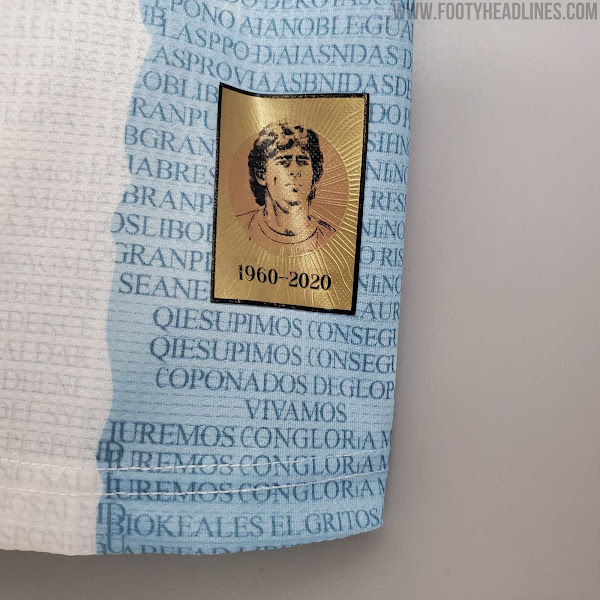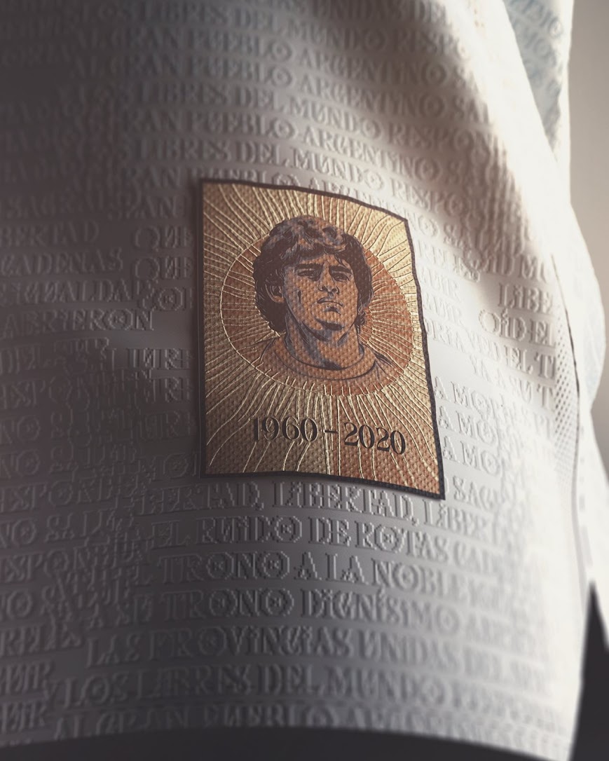Auf dem Shirt selbst ist ein dezenter Text der argentinischen Nationalhymne eingeprägt. Auf der unteren linken Seite befindet sich ein spezielles Abzeichen, um den verstorbenen Maradona zu ehren.