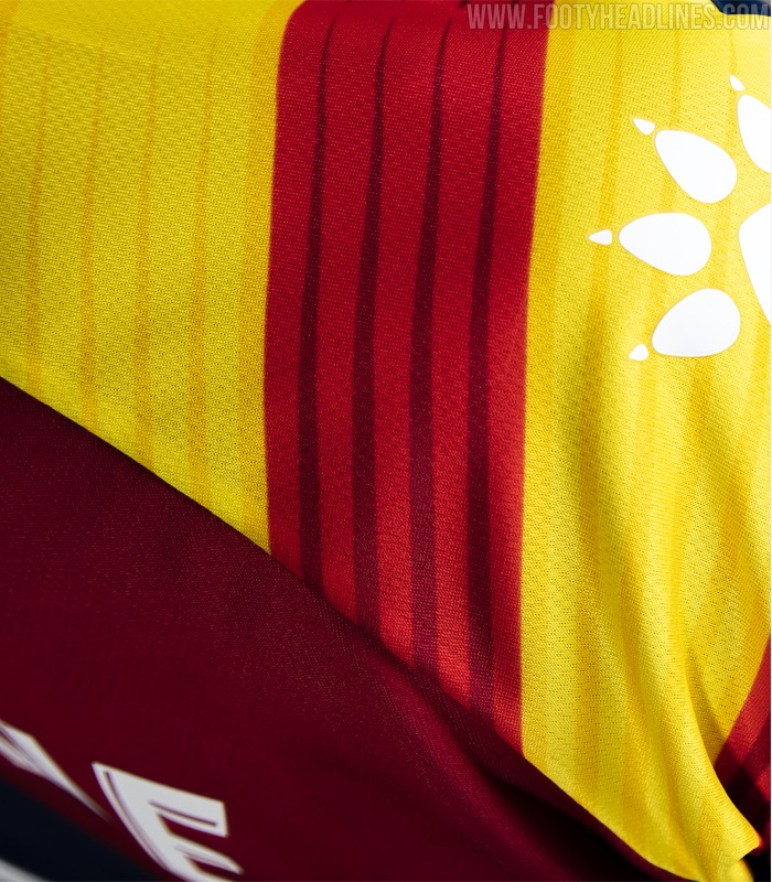 Das Kelme Huesca 2021 Day of Aragon Fußballtrikot kommt mit dem Wappen von Aragon, der cuatribarrada, auf den Ärmeln. Zusätzlich zu den fünf gelben und vier roten Streifen sind auf der Brust die klassischen Blaugrana-Farben als Halb-und-Halb-Look zu sehen.