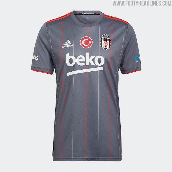 Das neue Besiktas 21-22 dritte Trikot ist dunkelgrau mit hellgrauen & roten Nadelstreifen.