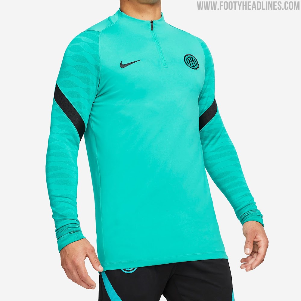 Das Inter 2021-2022 Trainingstrikot ist teal mit schwarz, basierend auf der auffälligen neuen Template von Nike. Das Logo ist in einer monochromen Version aufgebracht.