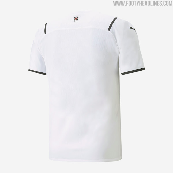 Lediglich der Name des Landes, Österreich, erscheint zentriert unter dem Puma Logo und eingerahmt von zwei dünnen Streifen in den Farben der Nationalflagge. Das Teamabzeichen ist auf dem oberen Rücken unterhalb des Ausschnitts zu sehen.