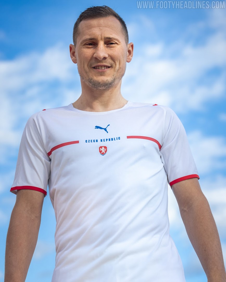 Das Puma Tschechische Republik 2021-22 Auswärtstrikot ist hauptsächlich weiß-rot gestreift auf den Schultern und an den Seiten der Brust, während die Puma Logos auf der Vorderseite und den Ärmeln blau sind.