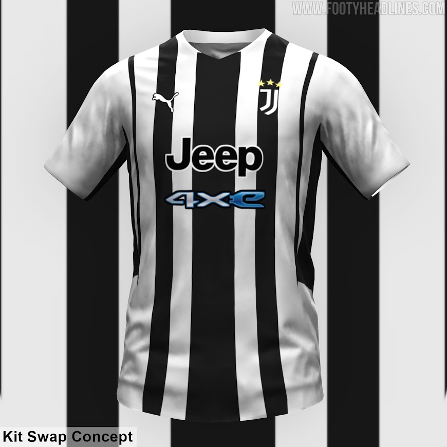Unser Juventus Konzept Trikot kommt mit dem Jeep 4xe Logo auf der Vorderseite, genau wie das aktuelle Juventus 21-22 Trikot.