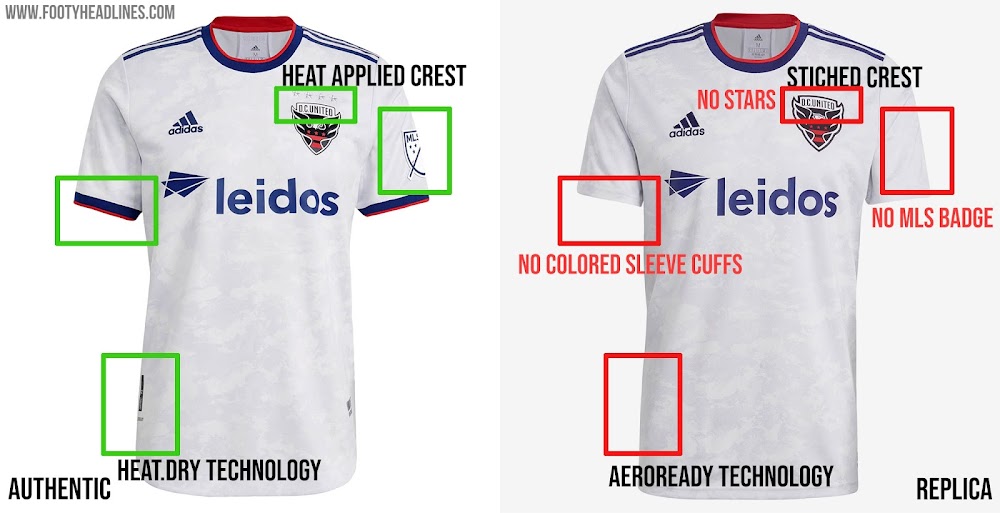 Die Replica und die authentischen Trikots haben unterschiedliche Kragen. Ein Spieler trägt nur die Replica Version, während der andere Spieler die authentische Version trägt. Die Replik hat einen V-Kragen, während das Spielerausgabe-Shirt einen Rundkragen hat.