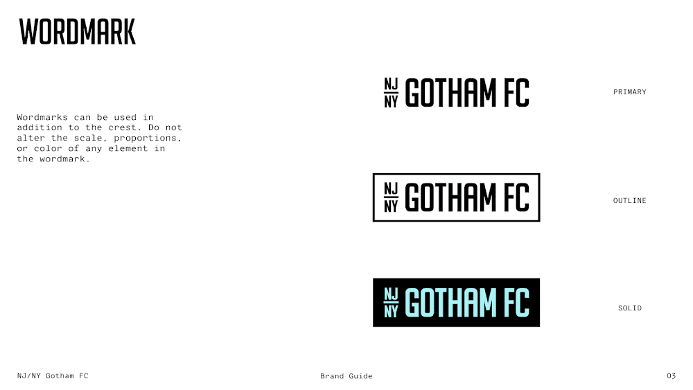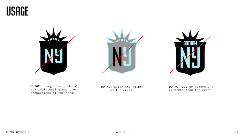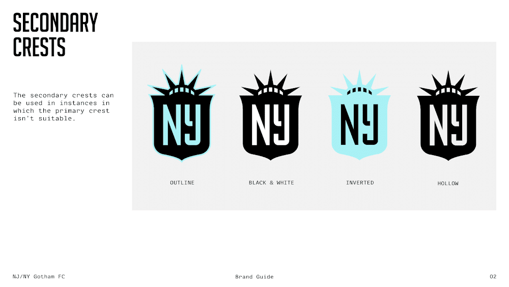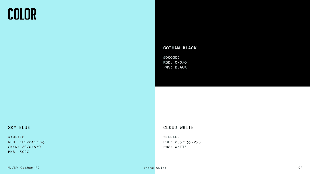 Der Gotham FC wird Elemente des letztjährigen aktualisierten Farbschemas beibehalten. Die offiziellen Farben des Vereins sind Sky Blue, Gotham Black und Cloud White.