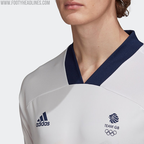 Basierend auf der Condivo 20 Template, ist das Adidas Großbritannien Tokio 2020 Olympia Trikot überwiegend weiß mit einem marineblauen Kragen und einem grafischen Druck auf der Vorderseite.