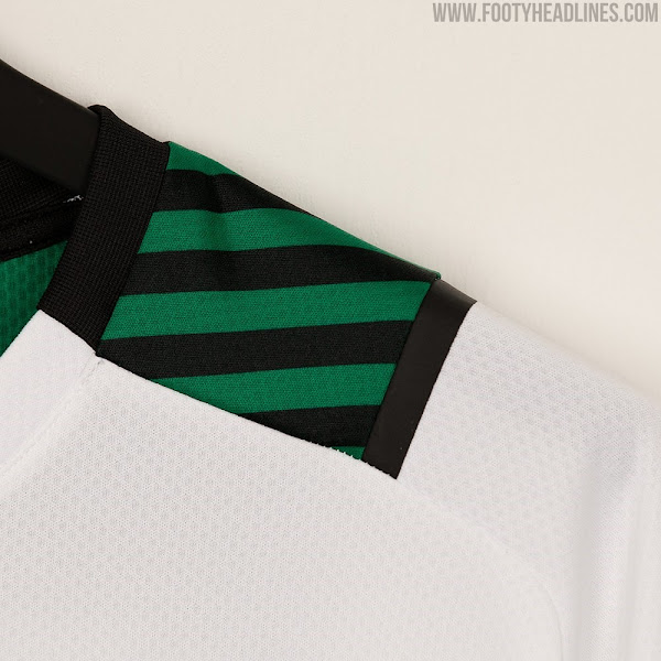 Das Puma Gladbach 2021-2022 Trikot kombiniert eine weiße Basis mit schwarzen Logos und verfügt über ein Schulterpanel mit schwarzen und grünen Querstreifen.