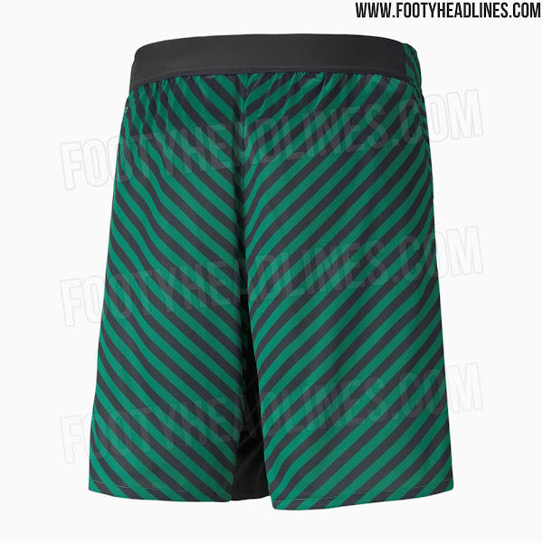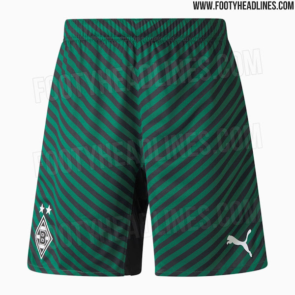 Puma kombiniert das Borussia Mönchengladbach 2021-22 Trikot mit einer weißen oder schwarz-grün gestreiften Hose und weißen Stutzen.