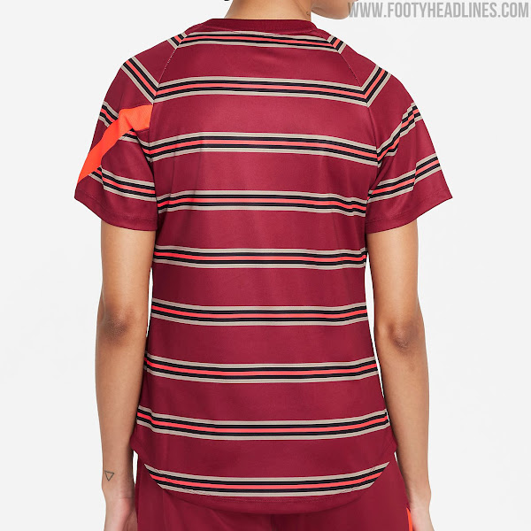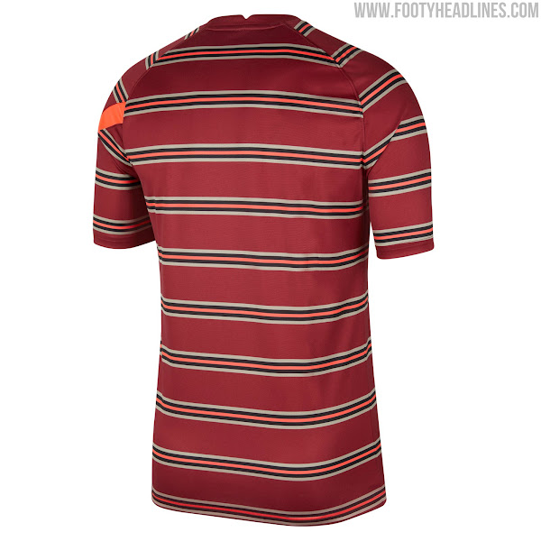 Das Nike Liverpool 2021-22 Pre-Match Trikot kombiniert eine rote Basis mit einem gold-schwarz-roten Reifenmuster, das die gesamte Vorderseite, den Rücken und die Ärmel bedeckt.
