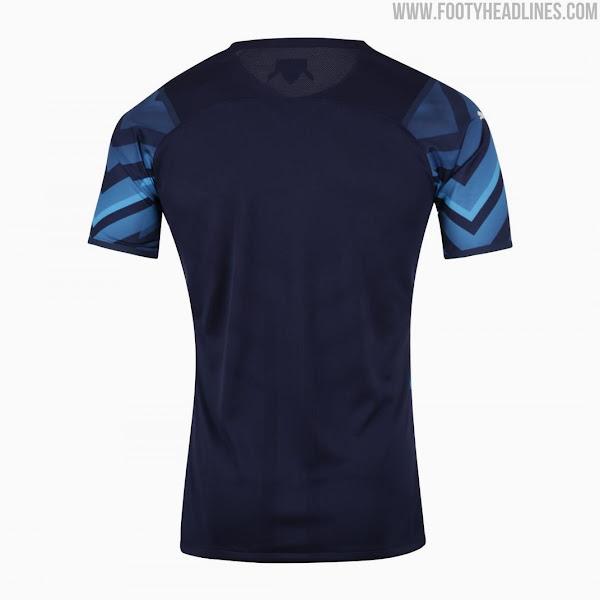 Das Puma Marseille 2021-22 Auswärtstrikot kombiniert eine dunkle marineblaue ("Peacot") Basis mit verschiedenen Blautönen ("Bleu Azur") für ein Zick-Zack Grafikdesign.