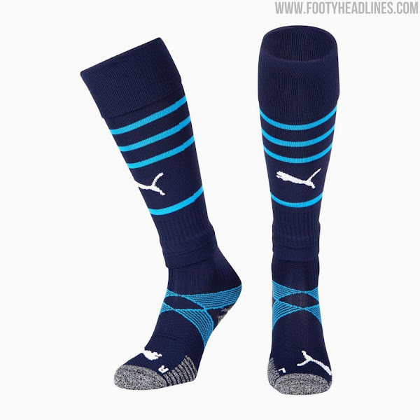 Marineblaue/weiße Hosen und marineblaue/himmelblaue/weiße Stutzen runden den Look des neuen Marseille 2021-22 Auswärtstrikots von Puma ab.