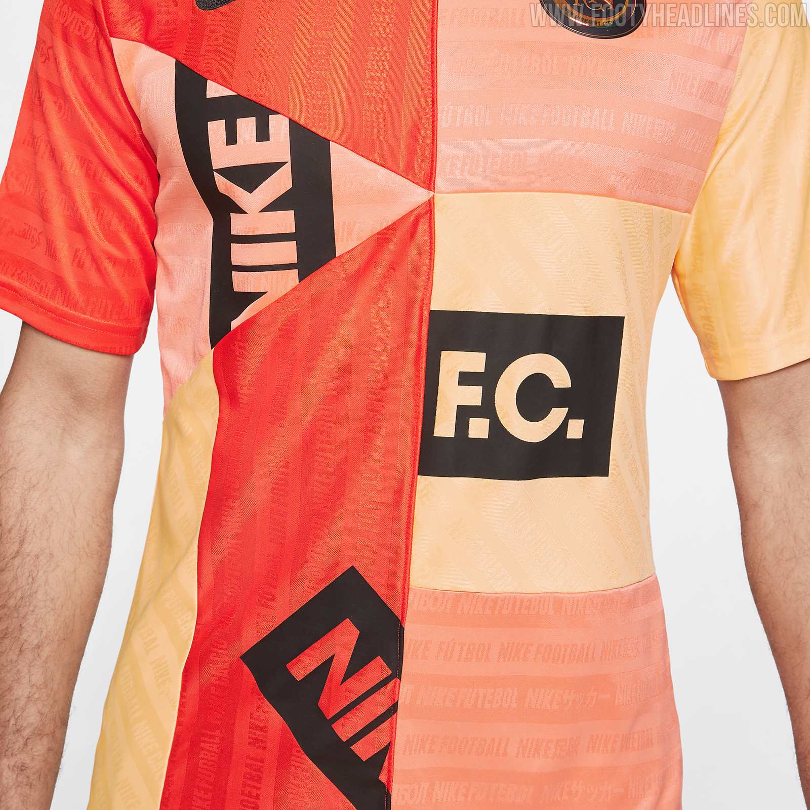 Das Nike F.C Germany Auswärtstrikot ist vom Design her gleich, wenn auch mit einem lebendigeren Look. Die Formen sind farblich in Pink, Rot, Melone mit schwarzem Nike F.C Logo und Details.