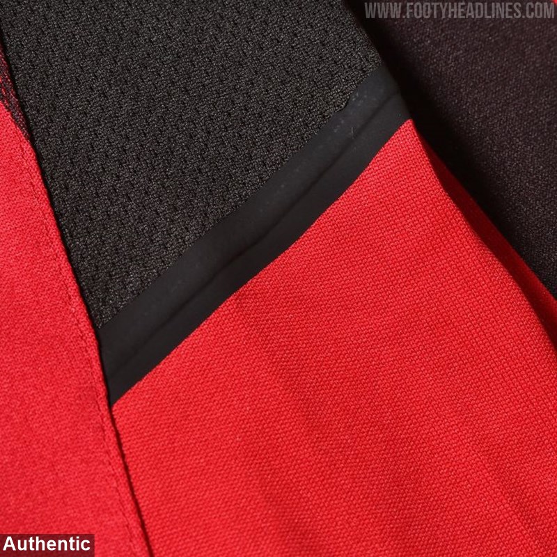 An den Seiten der beiden Trikots sieht die Stelle, an der sich die schwarzen und roten Aufnäher treffen, bei der authentischen Version schöner aus, aus offensichtlichen Gründen. Die gedruckte schwarze Linie auf dem Replikat hat ein glänzendes Finish im Vergleich zur matten Oberfläche des Originals.