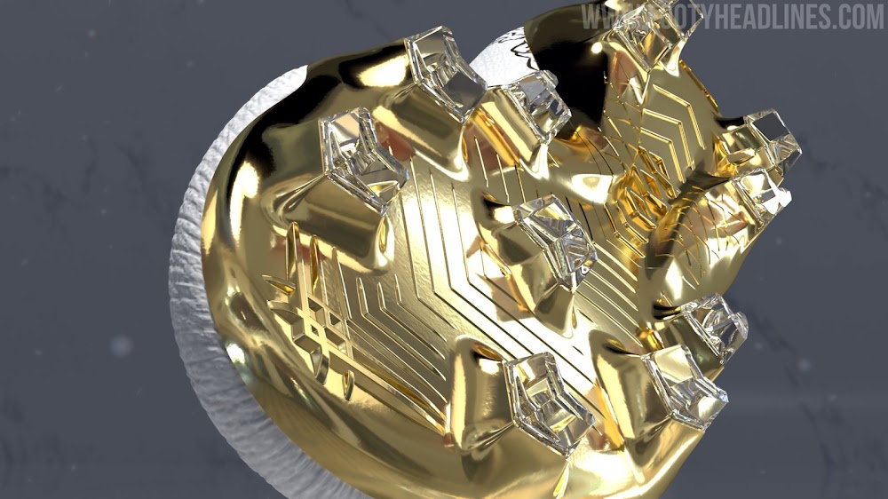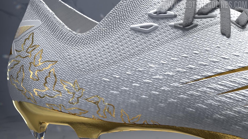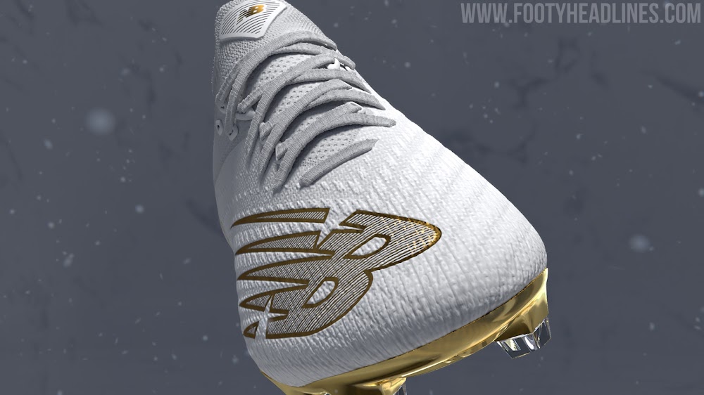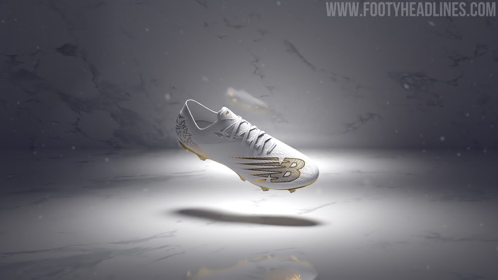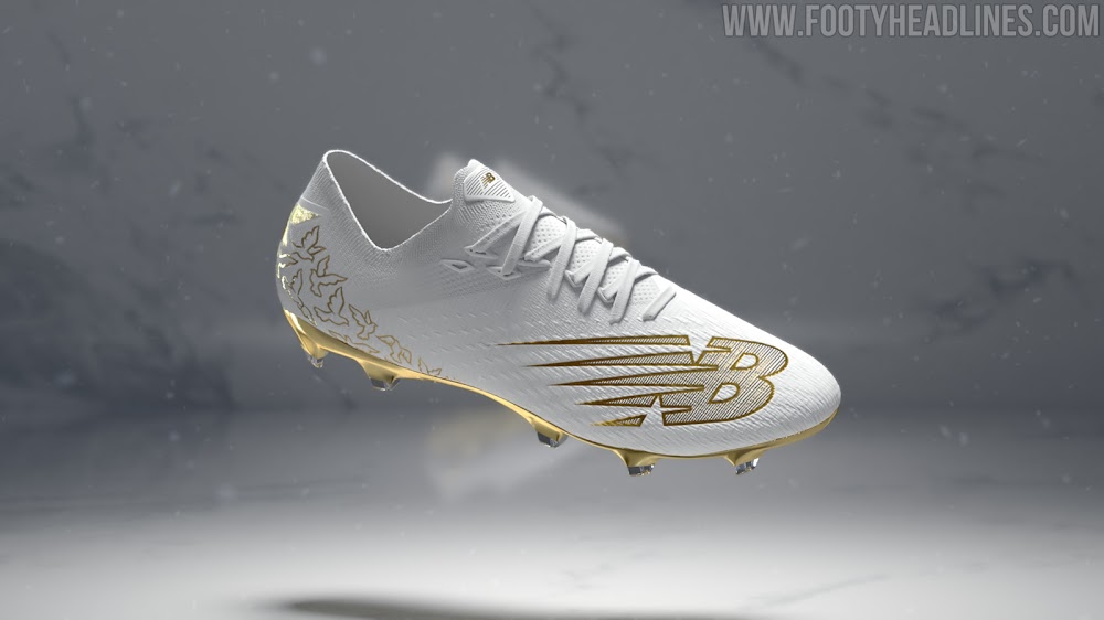 Die ersten Sterling New Balance Furon v6+ Fußballschuhe sind weiß / gold, kreiert von den Schuh Customizern @bcbootsuk. Sie haben eine goldene Vogelgrafik an der Ferse und eine metallisch goldene Sohlenplatte, und kommen nun auch mit einem NB Branding.
