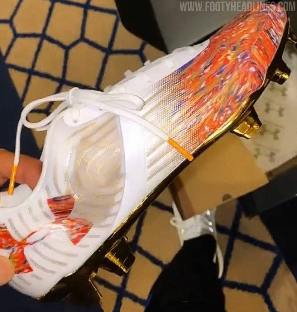 Die Under Armour Magnetico Pro SL Memphis Depay Euro 2020 Signature Cleats sind hauptsächlich weiß und haben ein einzigartiges orange-multicolor Design auf der Vorderseite. Die UA-Logos haben das gleiche Design.