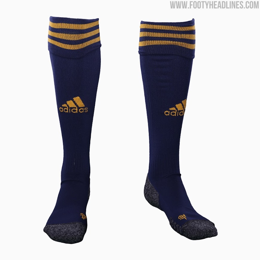 Marineblaue Hosen und Stutzen runden den Look des neuen Aberdeen FC 21-22 Auswärtstrikots von Adidas ab.