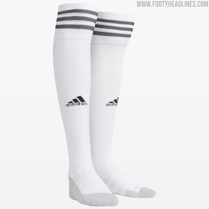 Weiß/schwarze Hosen und Stutzen runden den Look des neuen Fortuna Düsseldorf 2021-22 Auswärtstrikots von Adidas ab.