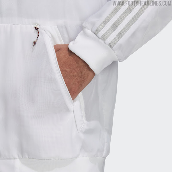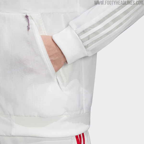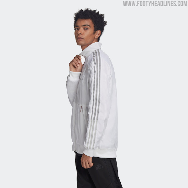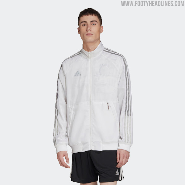 Alle Adidas Uniforia Hymnenjacken haben das gleiche Design. Sie sind alle weiß mit silbernen und grauen Details wie den drei Streifen und den beiden heat-transferierten Adidas- und Nationenlogos.