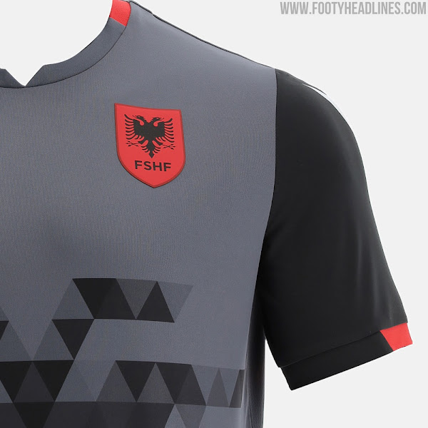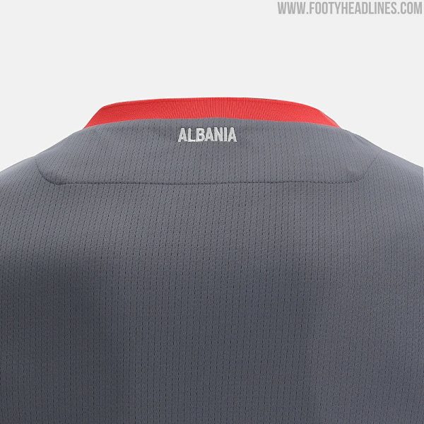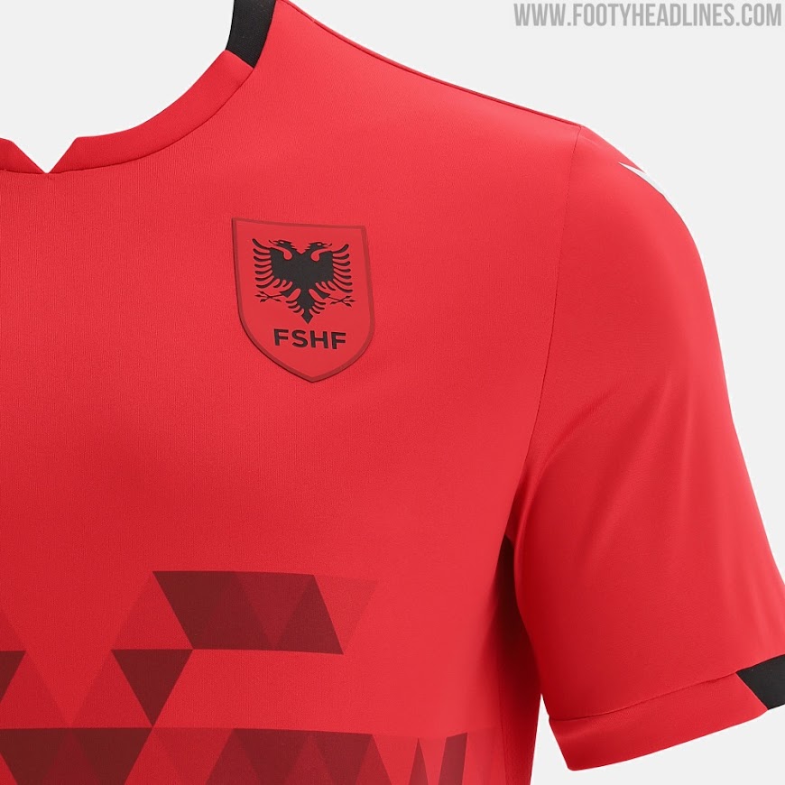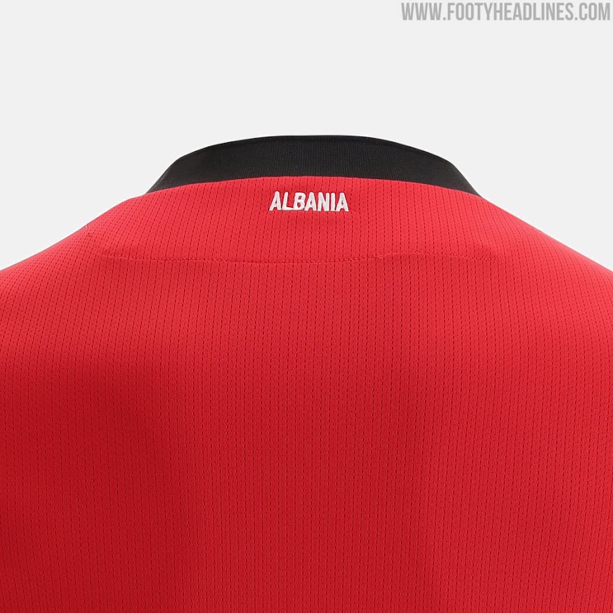 Das Trikot für Albanien ist in Rot gehalten, wobei einige Details am Kragen und den Manschetten in Schwarz gehalten sind. Das Macron Logo erscheint auf der Brust sowie auf den Schultern, während sich das albanische Wappen auf der linken Seite der Brust befindet.