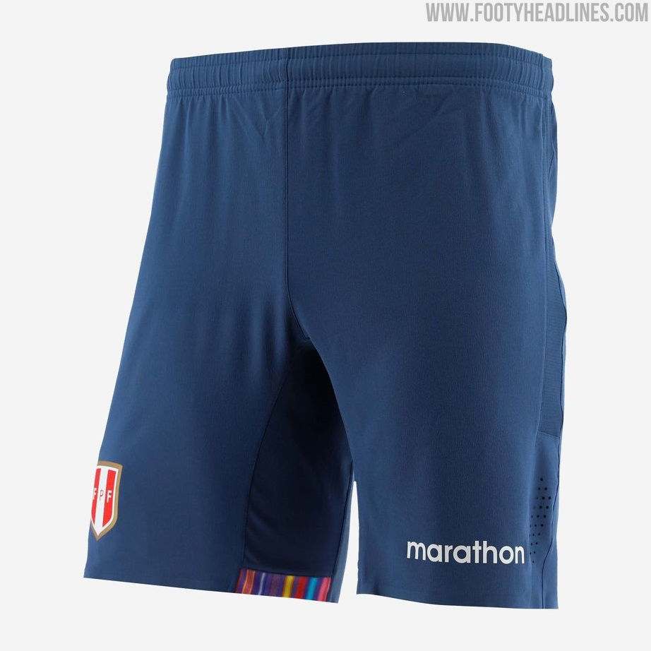 Das Marathon Peru 2021 Copa America Auswärtstrikot ist marineblau mit einem helleren Streifen. Vom Design her ist es das gleiche wie das Trikot.