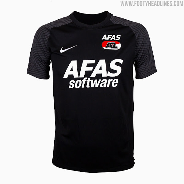 Das Nike AZ Alkmaar 2021-22 Auswärtstrikot ist schwarz mit weißen Logos, bsaed auf Nike's Strike II Template.