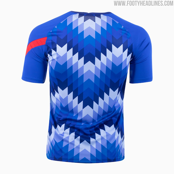 Basierend auf der gleichen Template wie die Pre-Match Trikots für England, Frankreich und Portugal, ist das Nike Chile 2020-2021 Pre-Match Trikot überwiegend blau mit einem tonalen geometrischen Grafikdruck auf der Vorderseite.